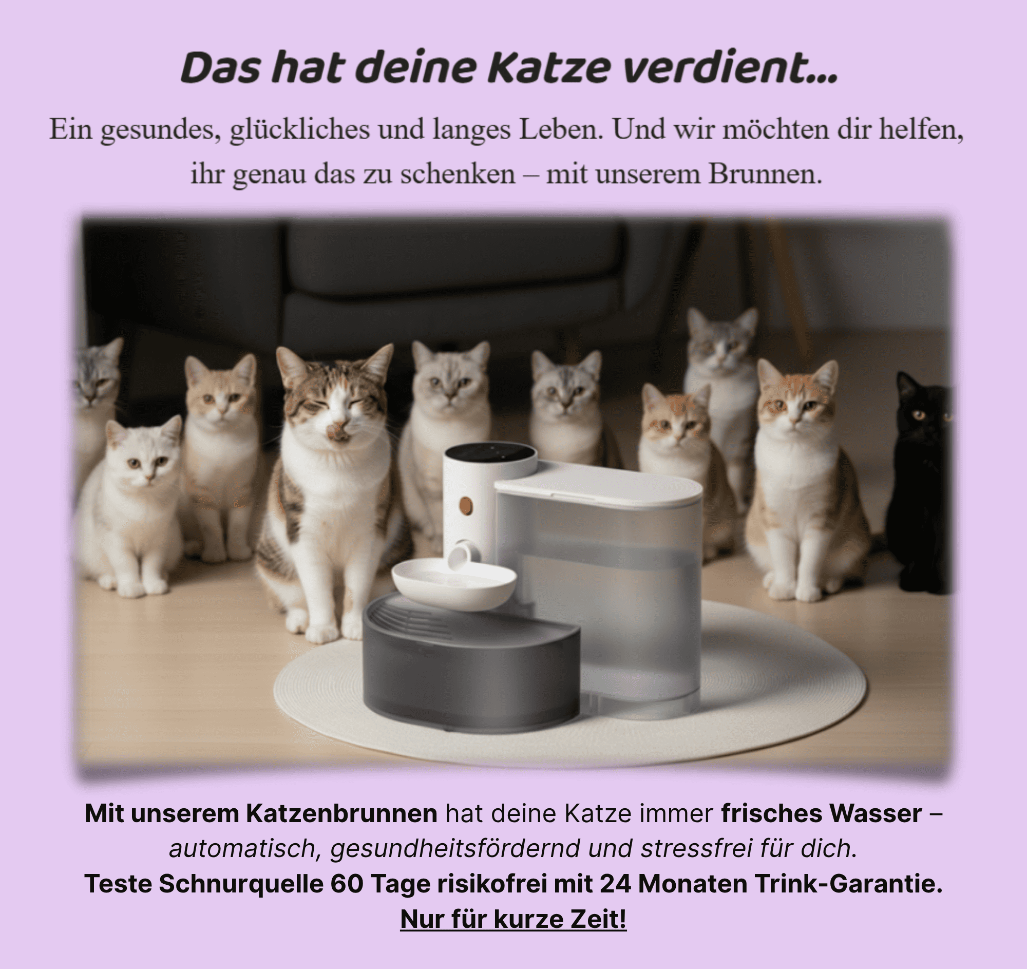 Keine Sorge – SchnurrQuelle ist so konzipiert, dass die meisten Katzen ihn sofort lieben. Sollte deine Katze den Brunnen zunächst ablehnen, bekommst du praktische Tipps zur Eingewöhnung, damit sie sich Schritt für Schritt daran gewöhnt. Und falls es dennoch nicht klappt, bieten wir flexible Rückgabe- oder Umtauschmöglichkeiten, sodass du kein Risiko eingehst. So stellst du sicher, dass dein Liebling immer frisches Wasser bekommt – stressfrei und unkompliziert. Durch unsere 60-Tage Null Risiko-Garantie kannst du innerhalb 60-Tage den Brunnen testen und wenn er dir nicht gefällt erhältst du den kompletten Kaufpreis Rückerstatte