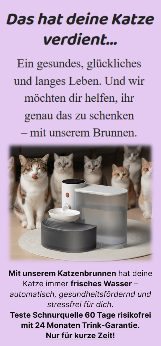 SchnurrQuelle ist für jede Katze geeignet – egal ob jung oder alt, Einzelkatze oder Mehrkatzenhaushalt, große Genießer oder wählerische Trinker. Besonders Katzen, die dazu neigen, zu wenig zu trinken, profitieren enorm. Der Brunnen ist so konzipiert, dass er Katzen natürlich zum Trinken animiert, ihr Wasser frisch hält und dir gleichzeitig den Alltag erleichtert. Mit SchnurrQuelle sorgst du dafür, dass deine Katze gesund bleibt, ohne zusätzlichen Aufwand oder komplizierte Routinen – weil jede Katze ein Recht auf ausreichend frisches Wasser hat.