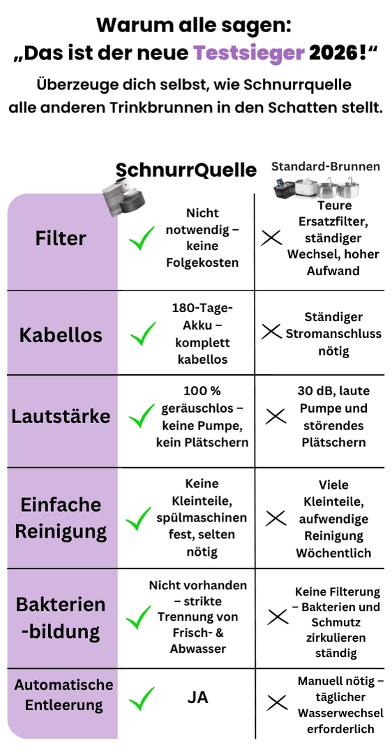 Top Trinkbrunnen! Mein Liebling und ich sind total begeistert. Endlich keine teuren Filter, kein aufwändiges Reinigen, keine laute Pumpe und nerviges Plätschern mehr. Seit ich den SchnurrQuelle Trinkbrunnen benutze, trinkt meine Katze deutlich mehr – Geb ihn nicht mehr her! 😺