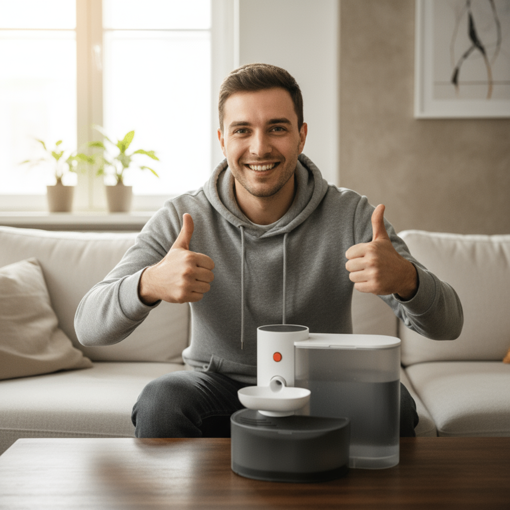 "Ich war skeptisch wegen der Reinigung – aber der Brunnen ist total pflegeleicht! Kein Schleppen von Näpfen mehr, kein abgestandenes Wasser. Meine Katze Cleo liebt das Plätschern, ich liebe die Ruhe.“